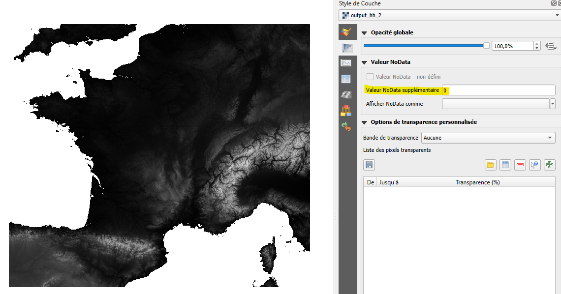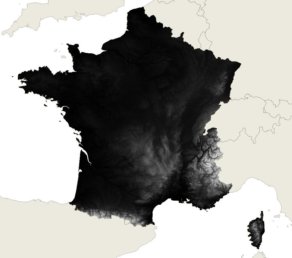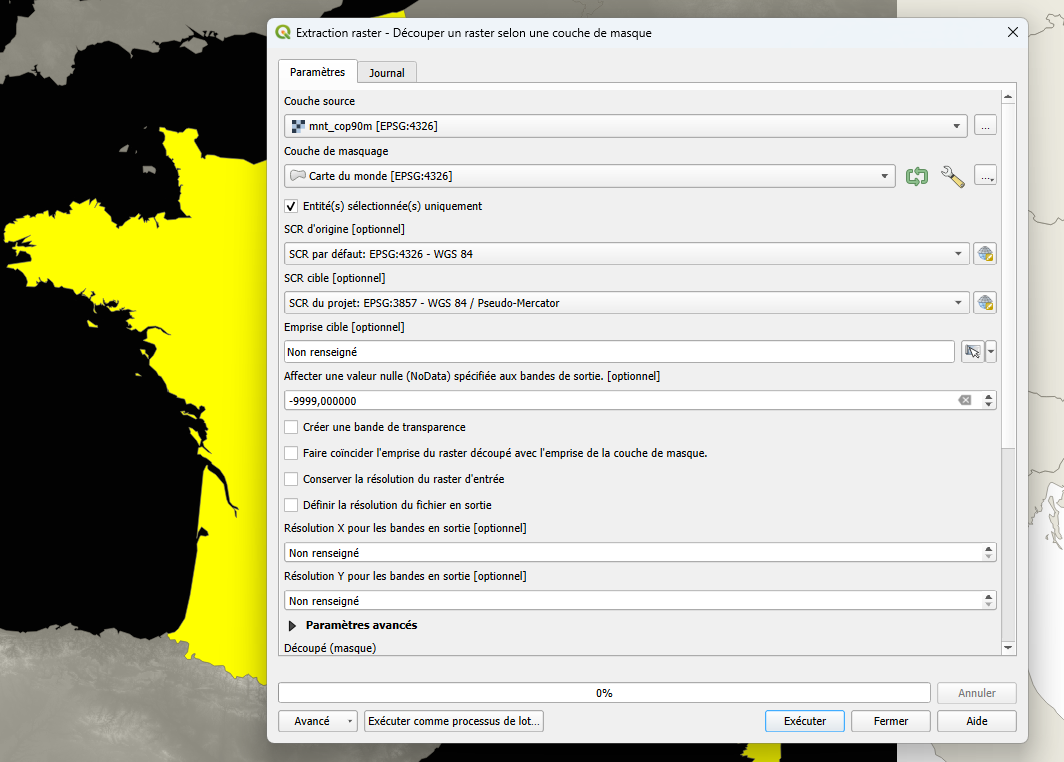 Allez, allez, la découpe n'attend pas. Je sélectionne la France et hop, menu > raster > extraction > Découper un raster selon une couche de masque